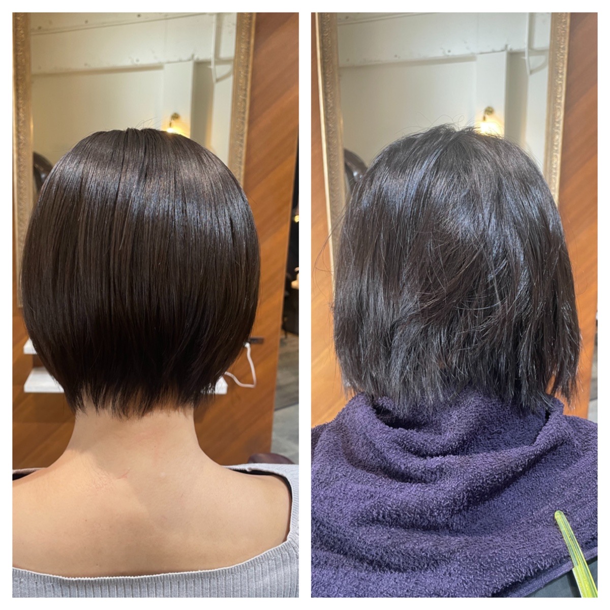 施術前はうねりや広がりがあり、まとまりにくい状態でしたが、施術後は毛先までなめらかに整い、自然な艶と丸みを感じられる仕上がりになりました。