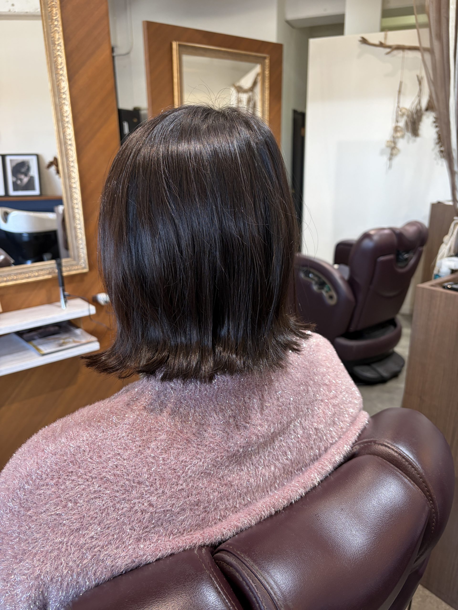 パーマヘアに飽きたため、肩につかないぐらいの長さに切ってほしいというオーダーをいただき写真のように外ハネボブにさせていただきました!!